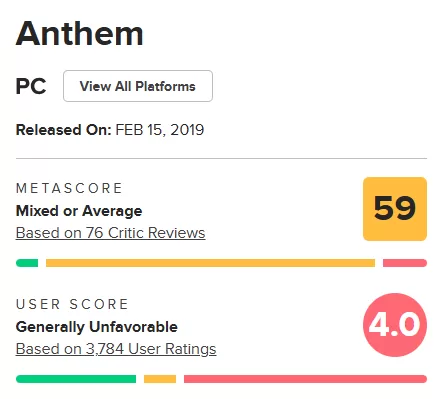 No caso de Anthem, o resultado foi ainda mais drástico: seis anos após seu lançamento, o título permanece com apenas 59 pontos na plataforma, refletindo os inúmeros problemas de performance, a falta de conteúdo de endgame e, posteriormente, a decisão de encerrar o desenvolvimento.
